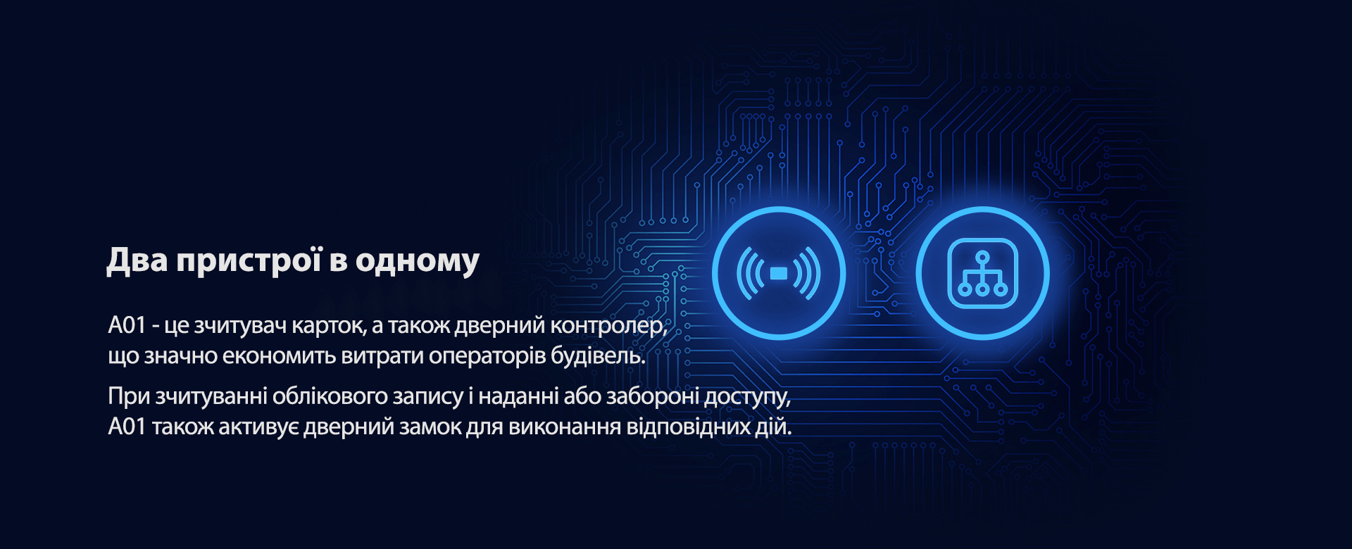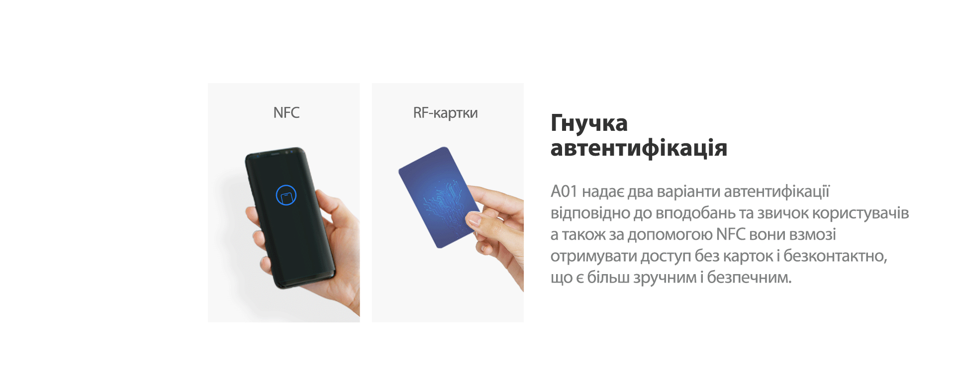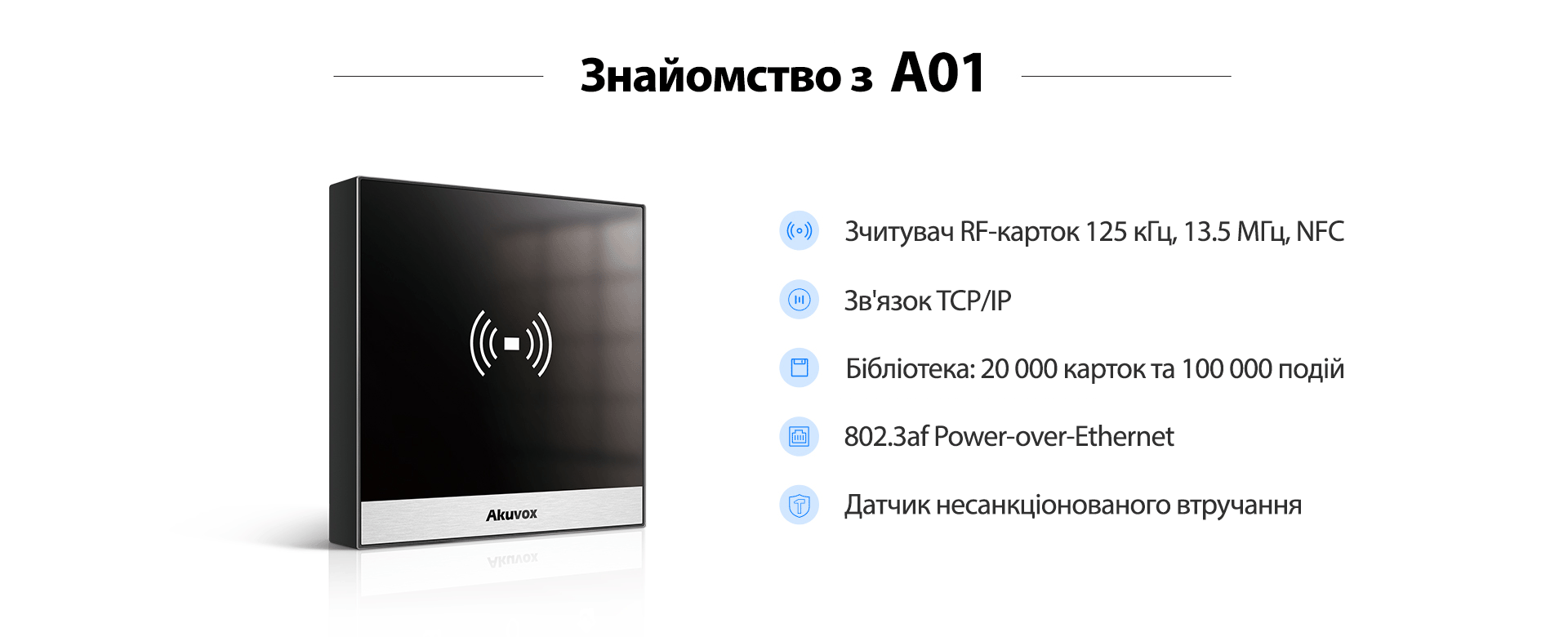 A01 – це IP-термінал контролю доступу, який поєднує в собі дверний контролер і зчитувач карток в одному пристрої. Він пропонує гнучкість варіантів надання доступу за допомогою RFID-карток та NFC.