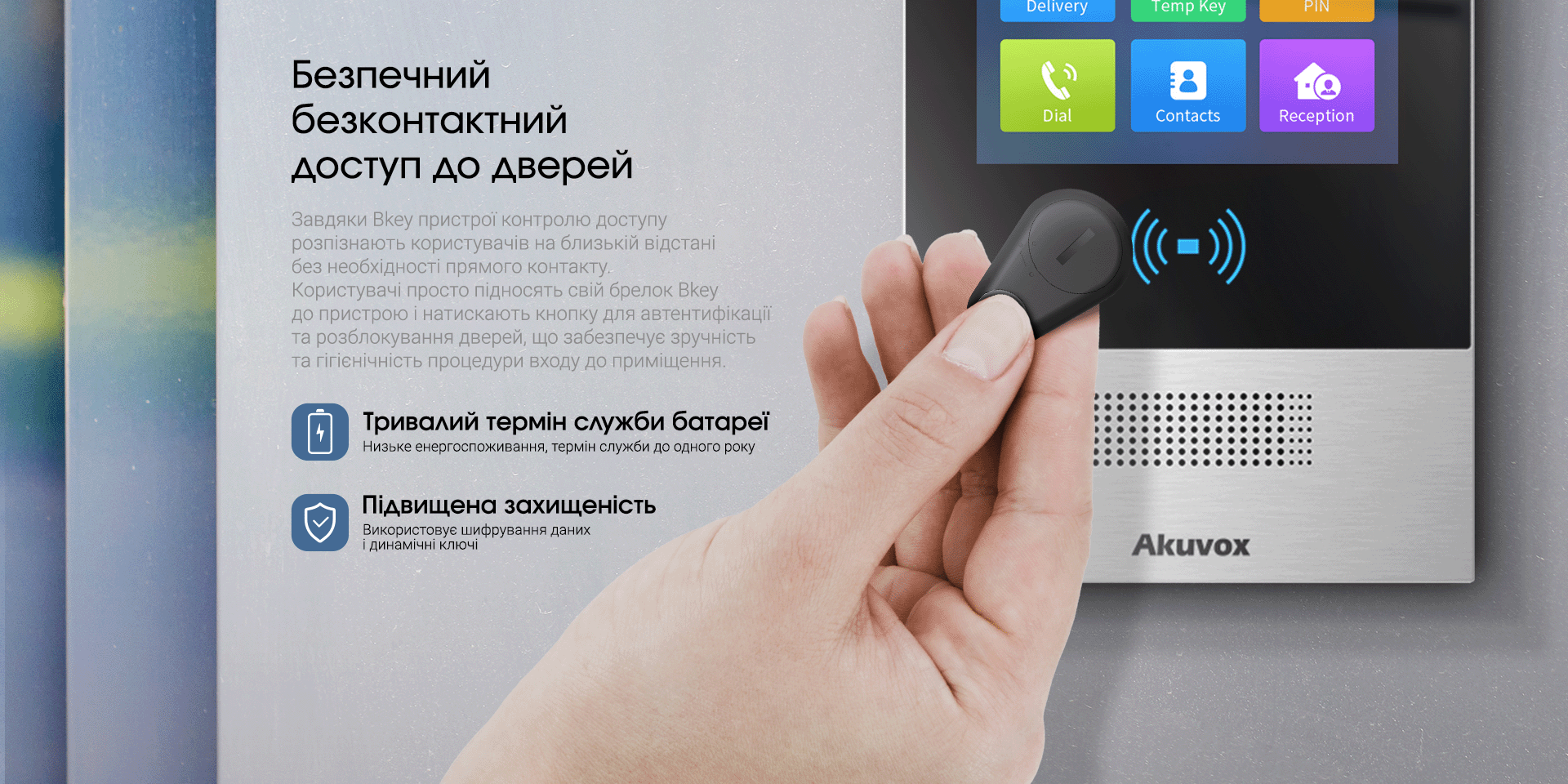 Брелок Bkey – це компактна та легка картка доступу, яка працює разом з панелями виклику та терміналами контролю доступу від Akuvox, забезпечуючи енергоефективний, надійний і безпечний спосіб відчинення дверей за допомогою Bluetooth.