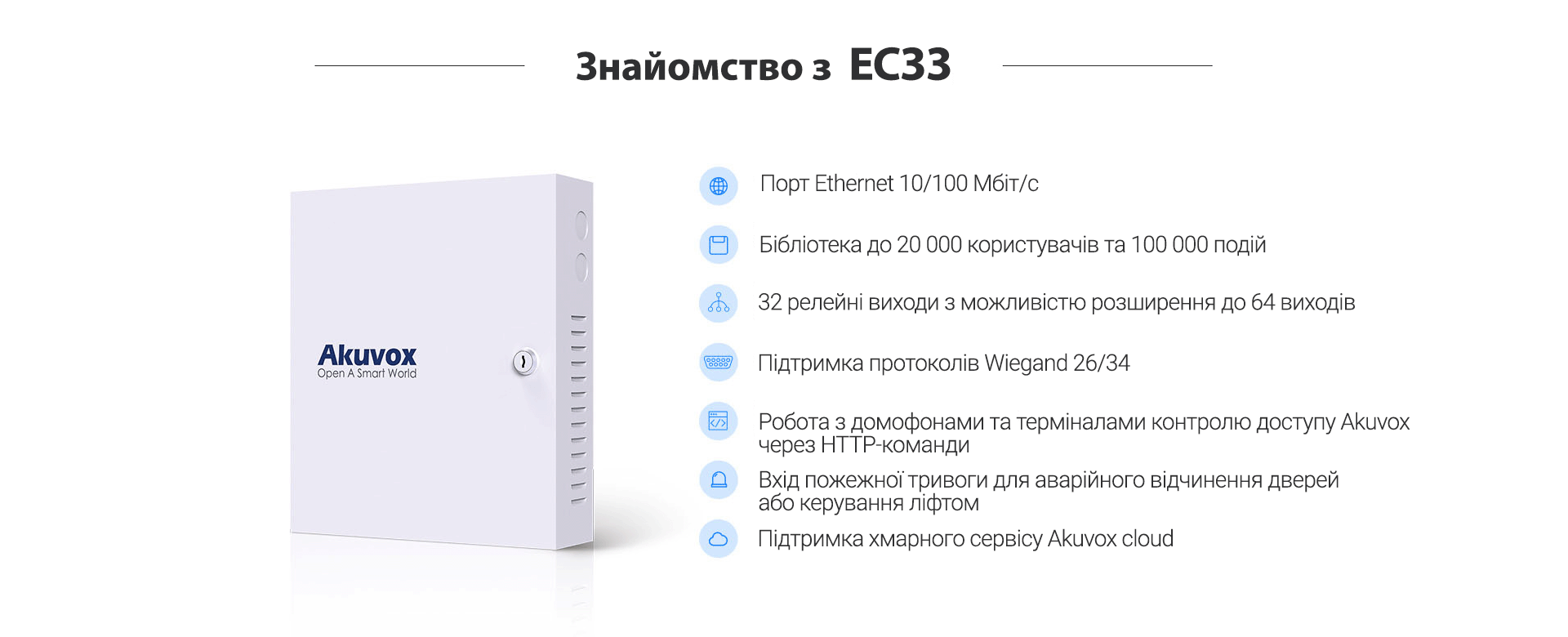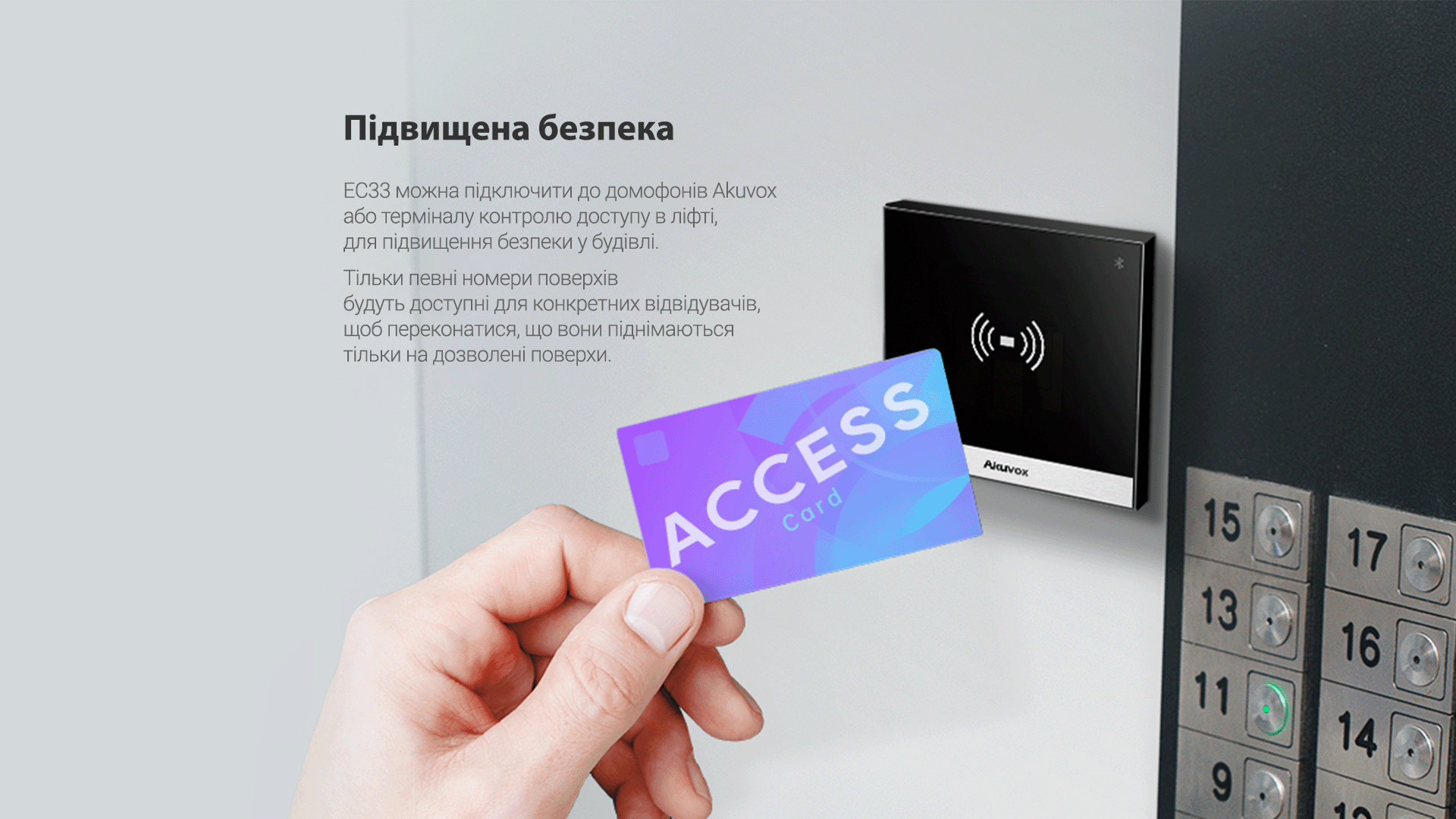 Akuvox EC33 – це IP-контролер доступу до ліфта, який працює з усіма домофонами та терміналами контролю доступу Akuvox. Зазвичай використовується в багатоквартирних та офісних будівлях для підвищення безпеки доступу до будівлі.