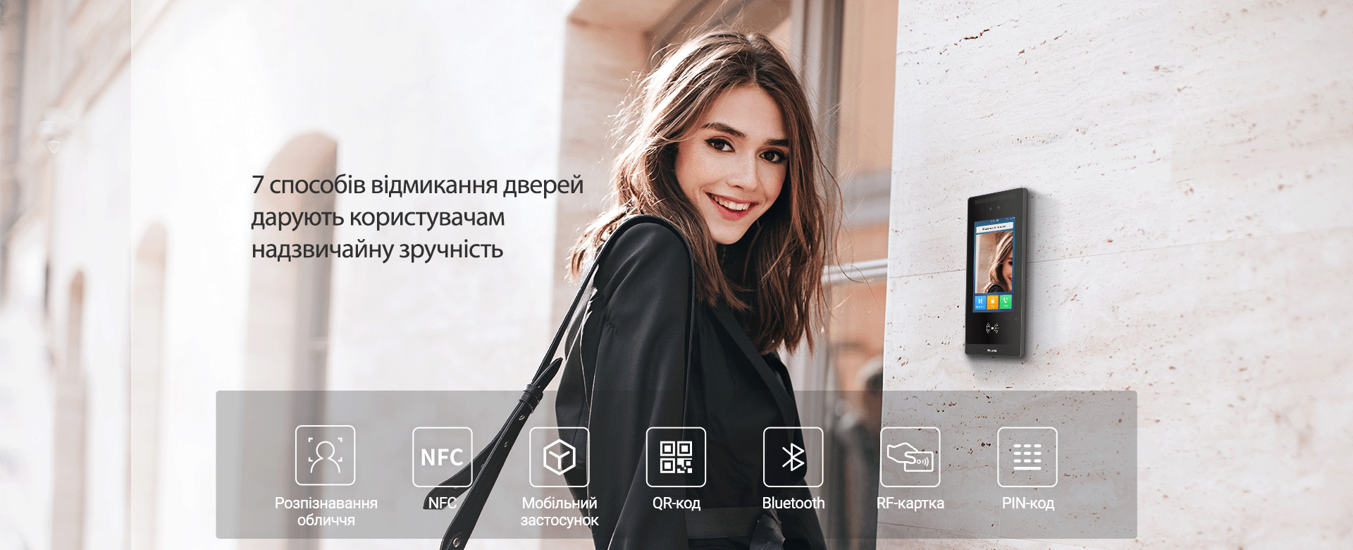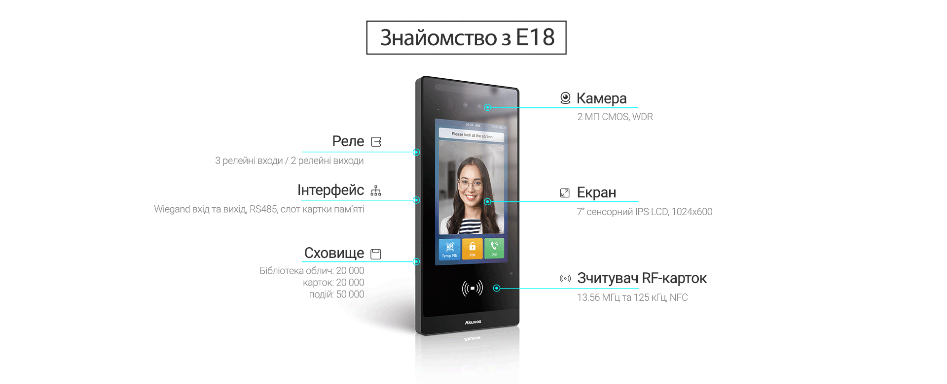 - Режими: розпізнавання обличчя, PIN та QR коди, RF-картки, BLE, NFC