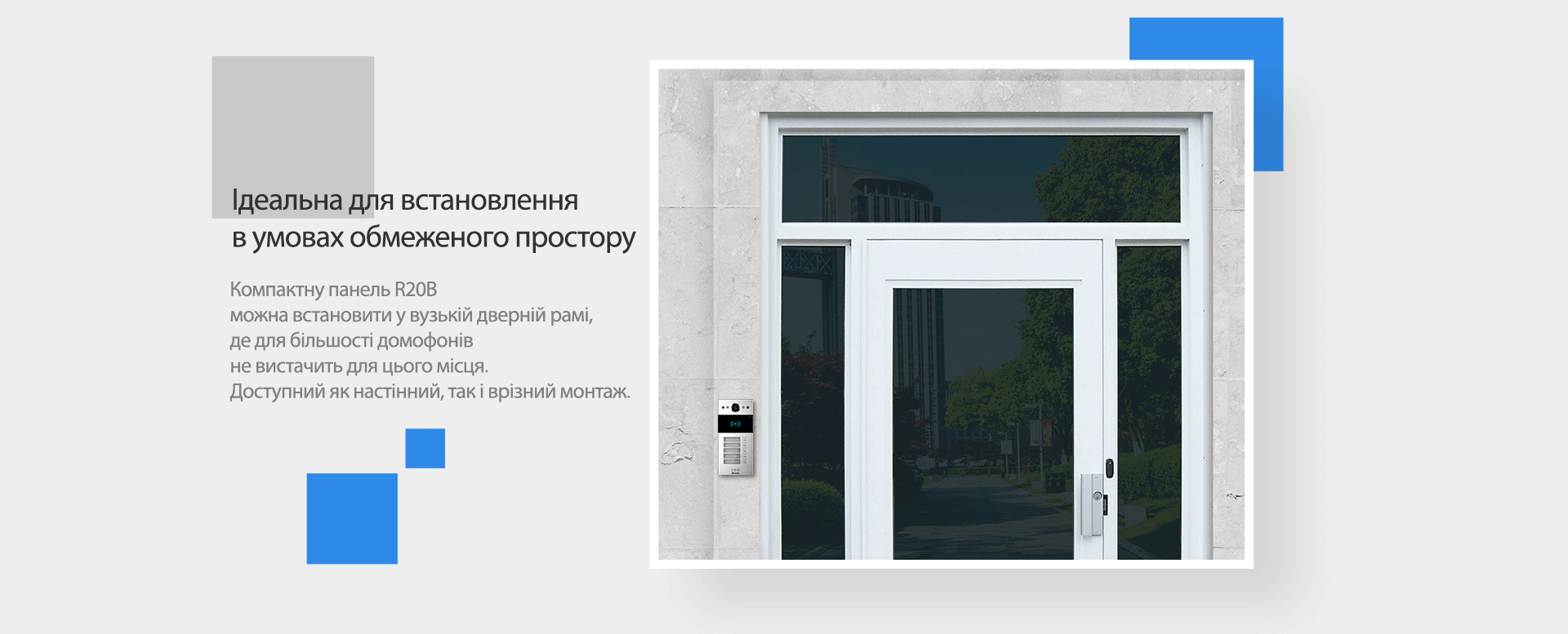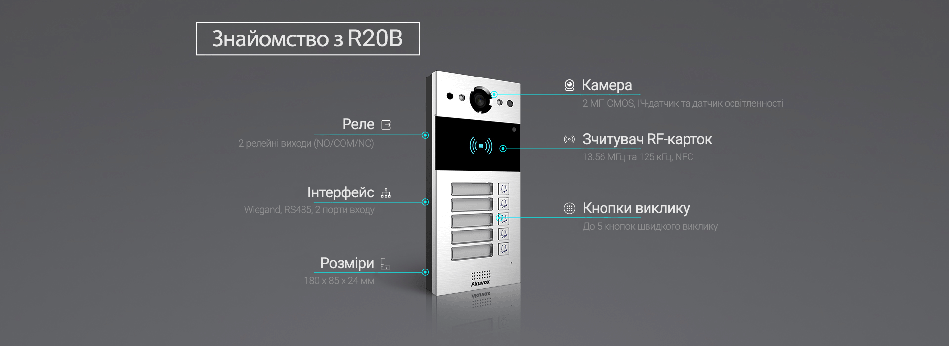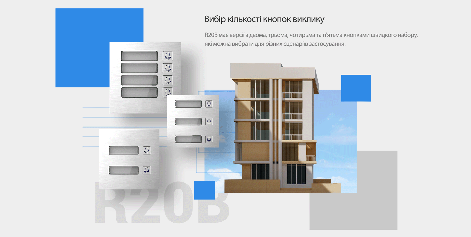 Akuvox R20B – це компактний SIP-відеодомофон, що має від 2 до 5 кнопок виклику, пристосований для зовнішнього використання та простий в установці,
