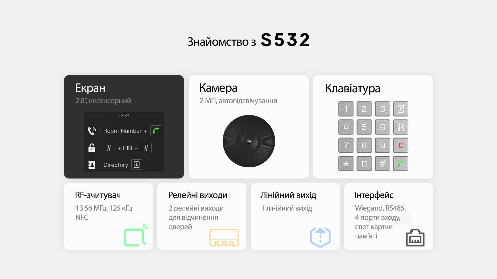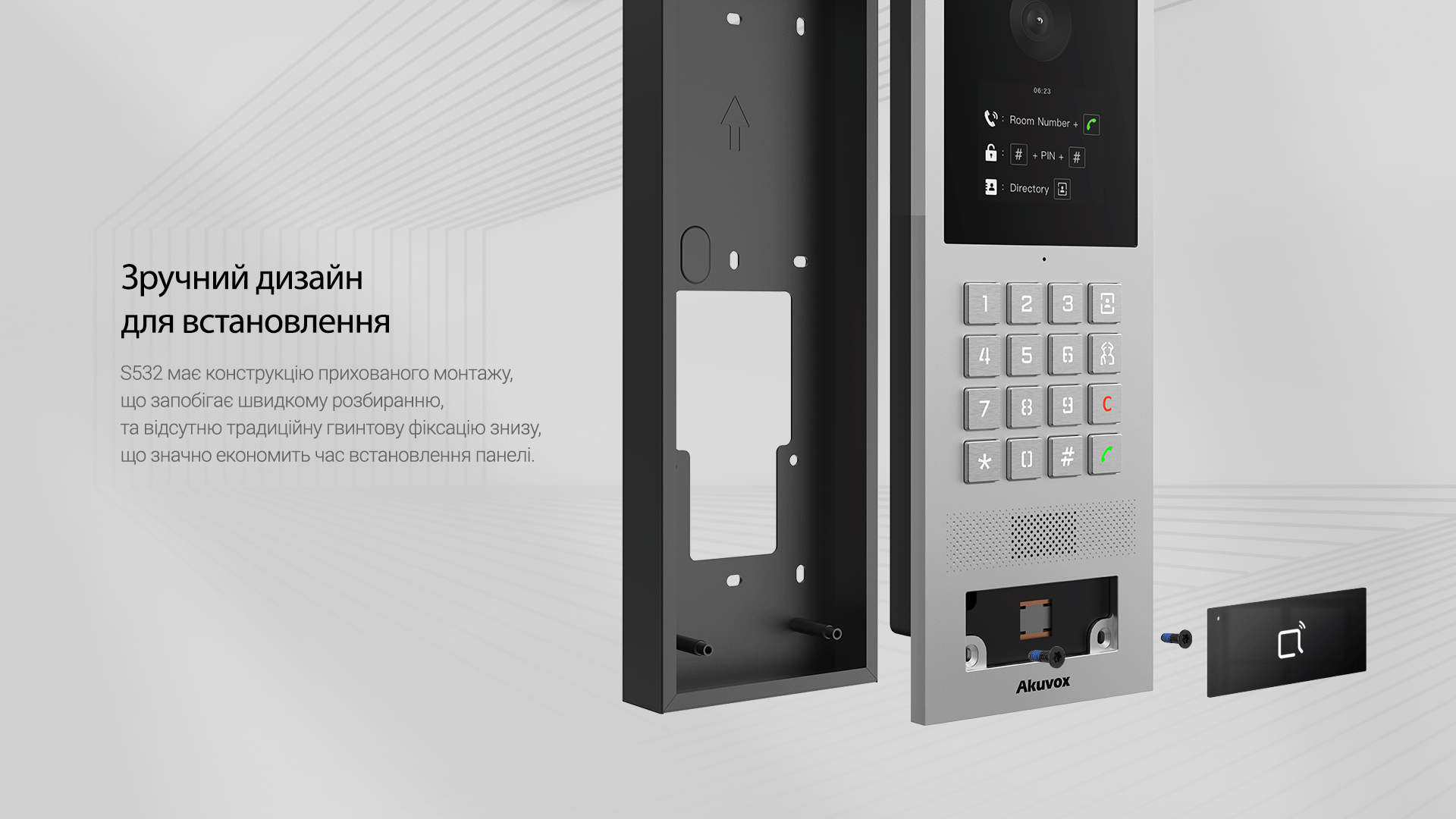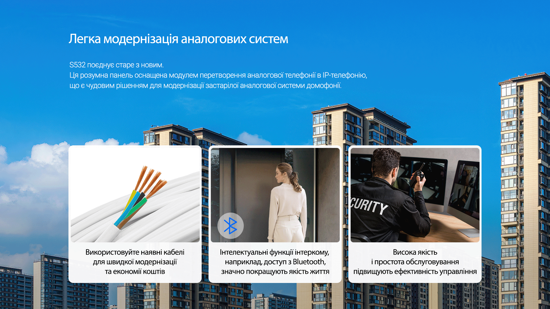 S532 поєднує старе з новим. Ця розумна панель оснащена модулем перетворення аналогової телефонії в IP-телефонію, що є чудовим рішенням для модернізації застарілої аналогової системи домофонії.