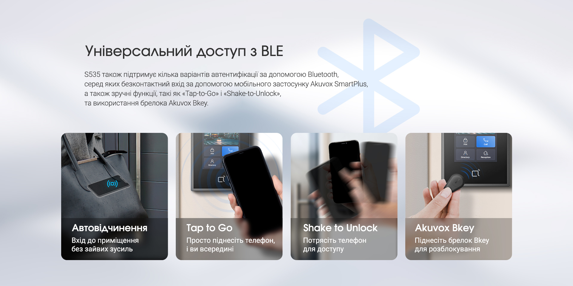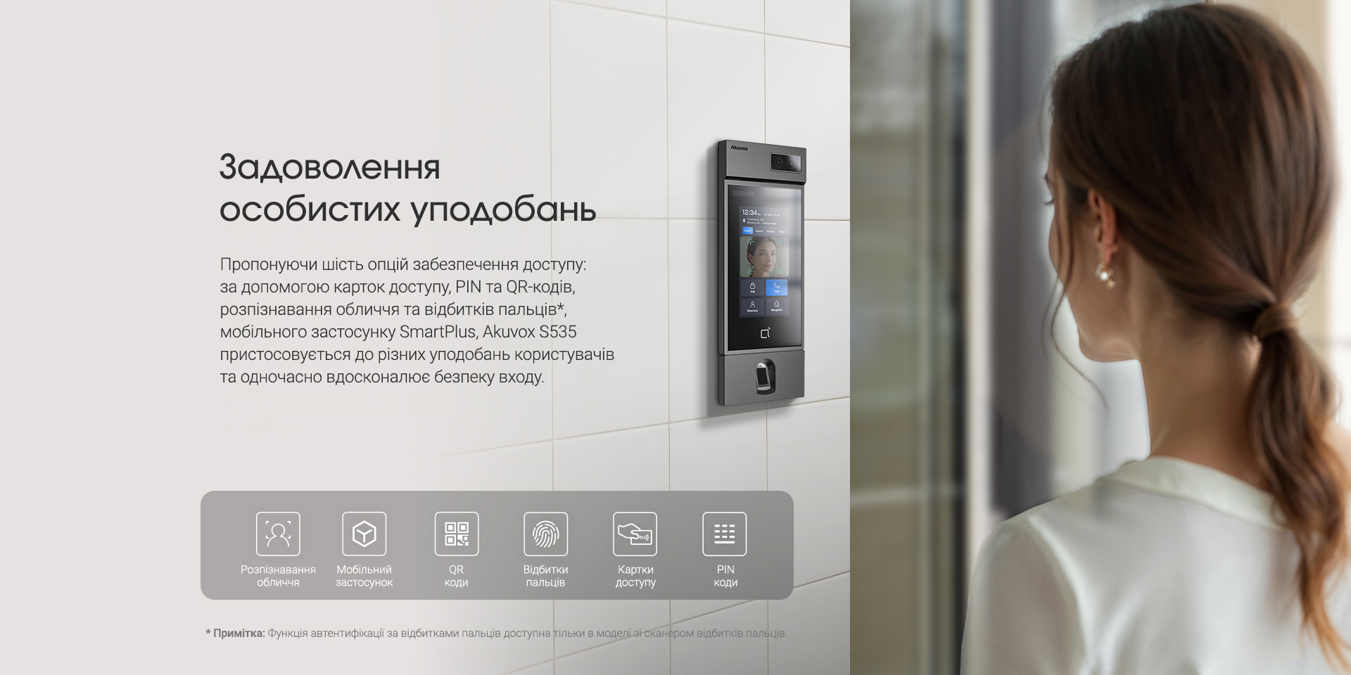 • Автентифікація за обличчям, картками доступу, PIN та QR кодами, BLE