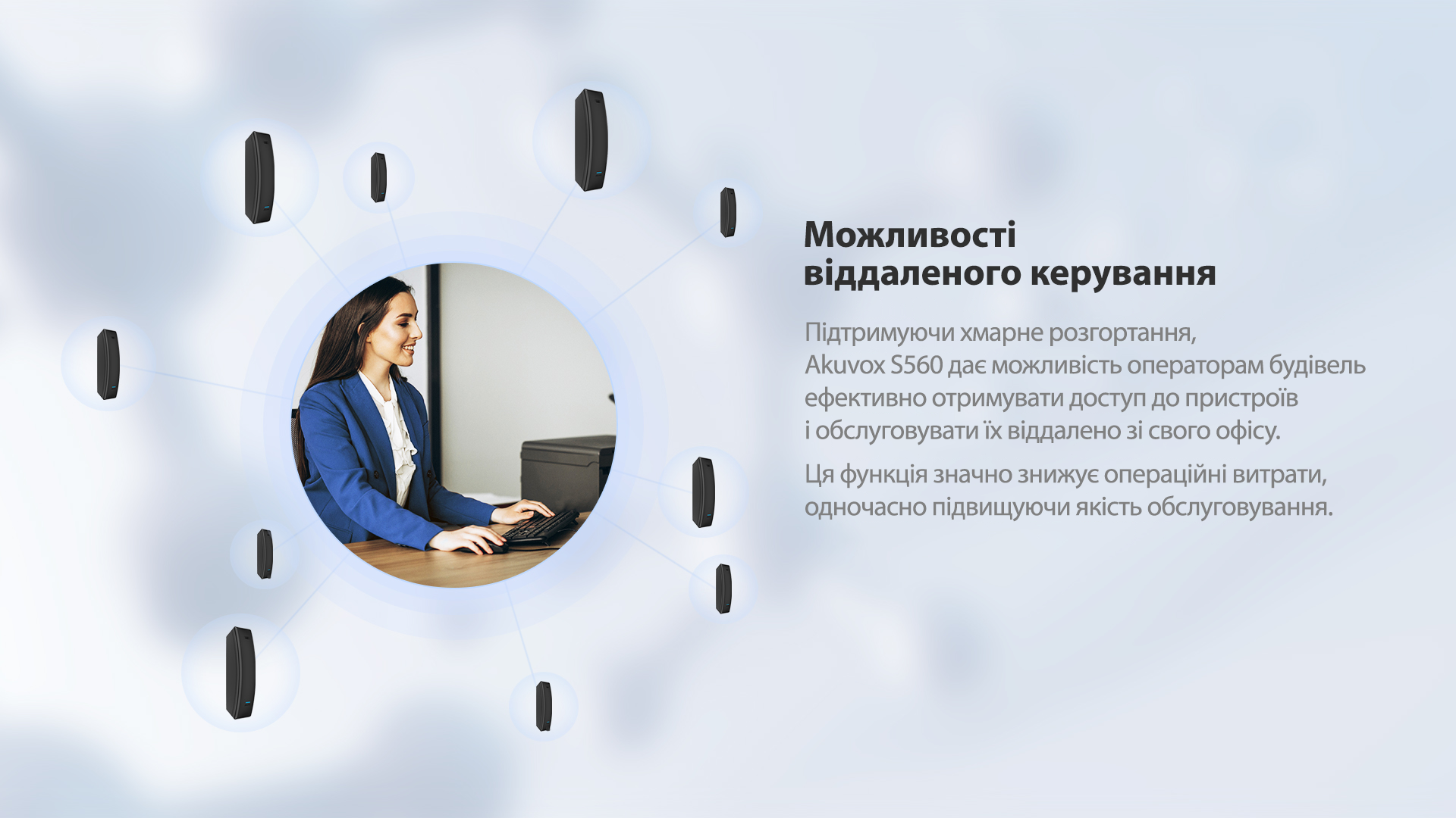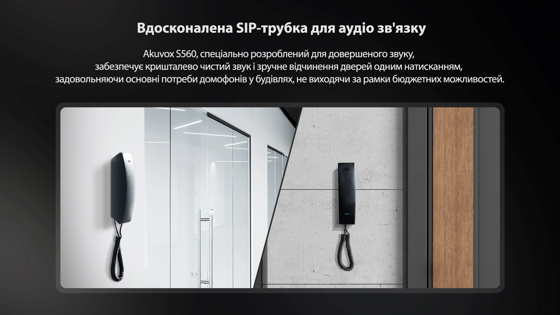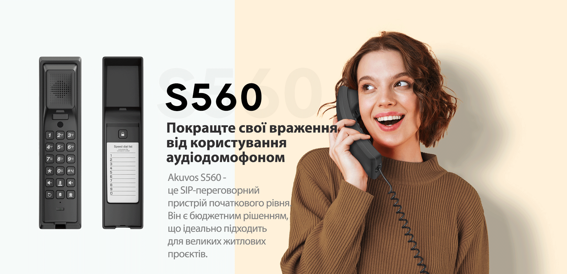 Akuvox S560 – це переговорний пристрій на базі протоколу SIP. Він підтримує основні функції інтеркому, такі як виклик і відмикання дверей, і може бути встановлений на стіні або розміщений на робочому столі. Завдяки компактному і мінімалістичному дизайну, він є ідеальним вибором для невеликих приміщень і чудово служить в якості додаткового пристрою.