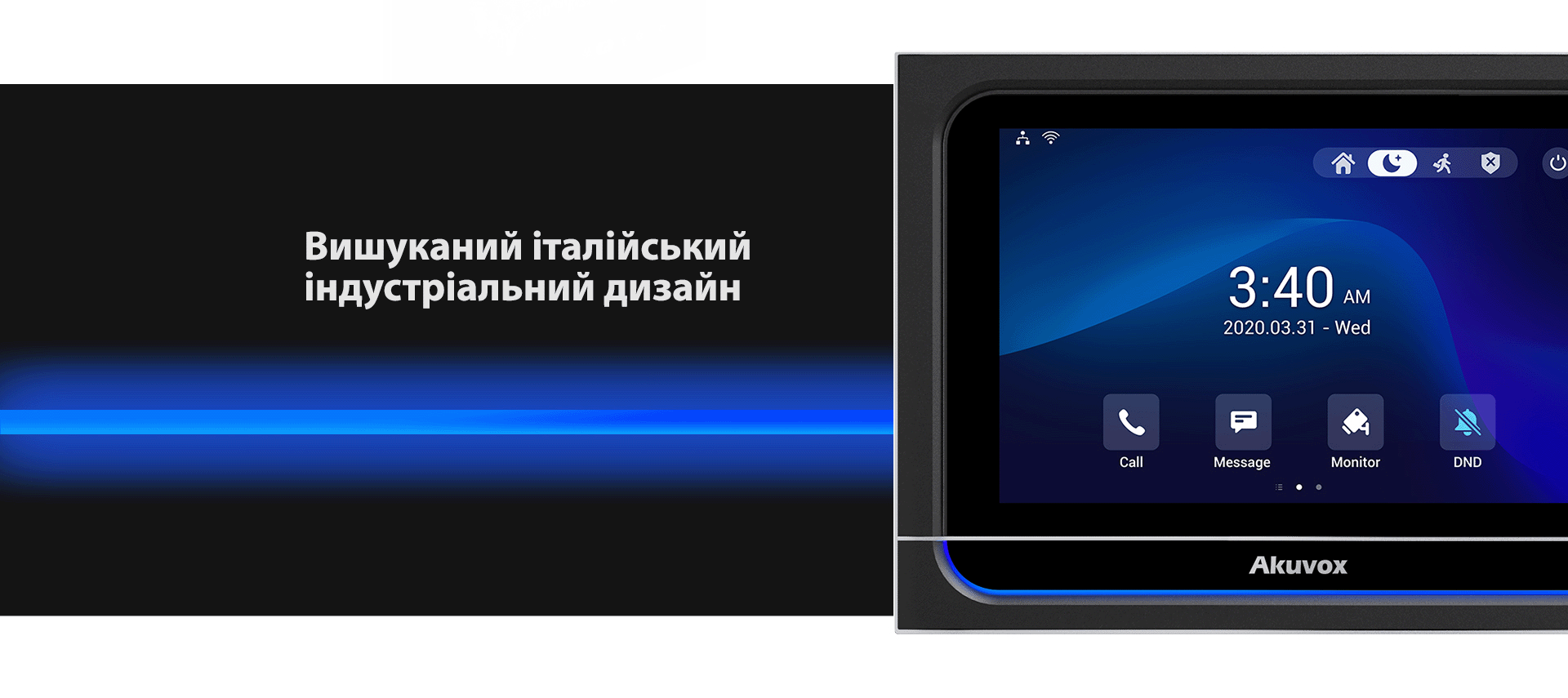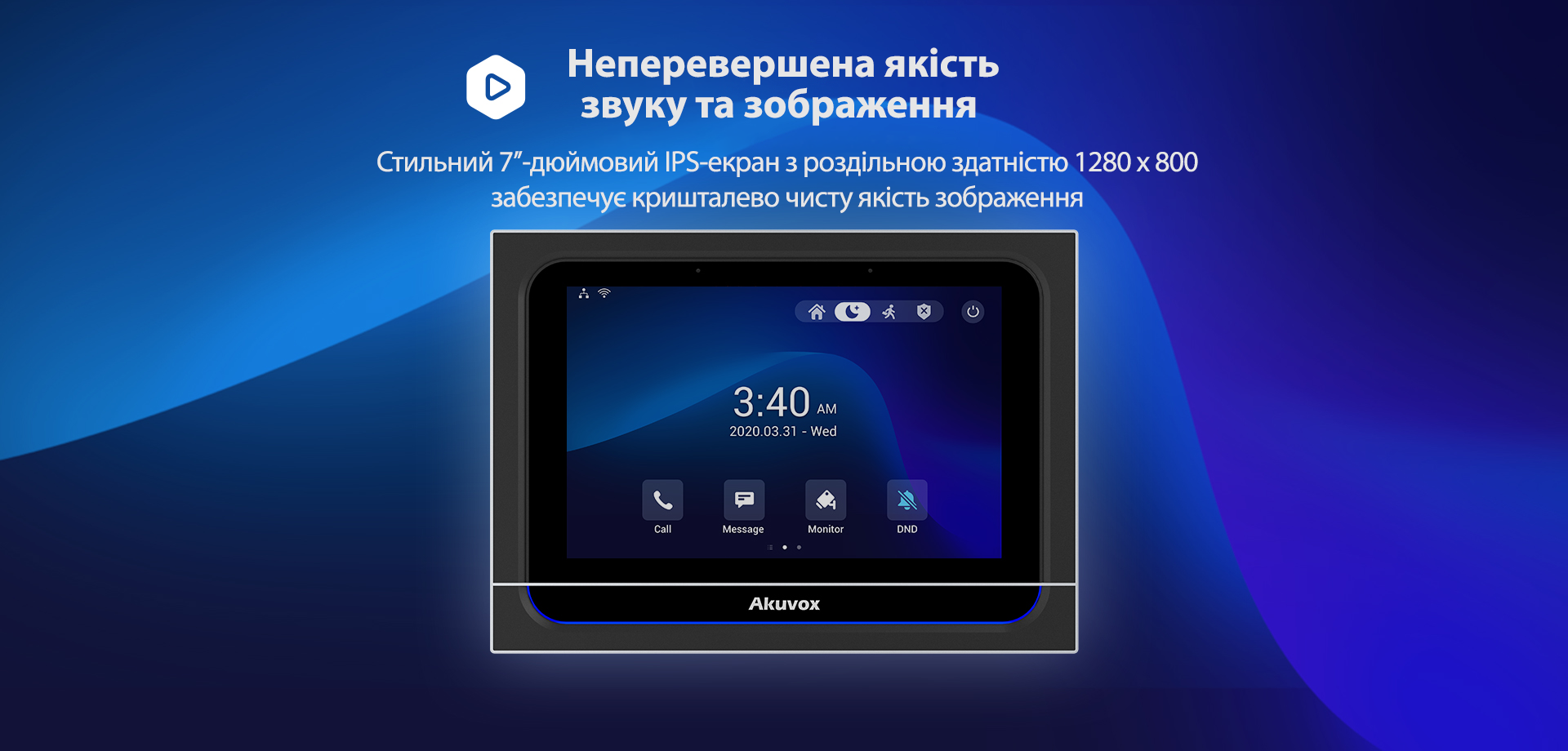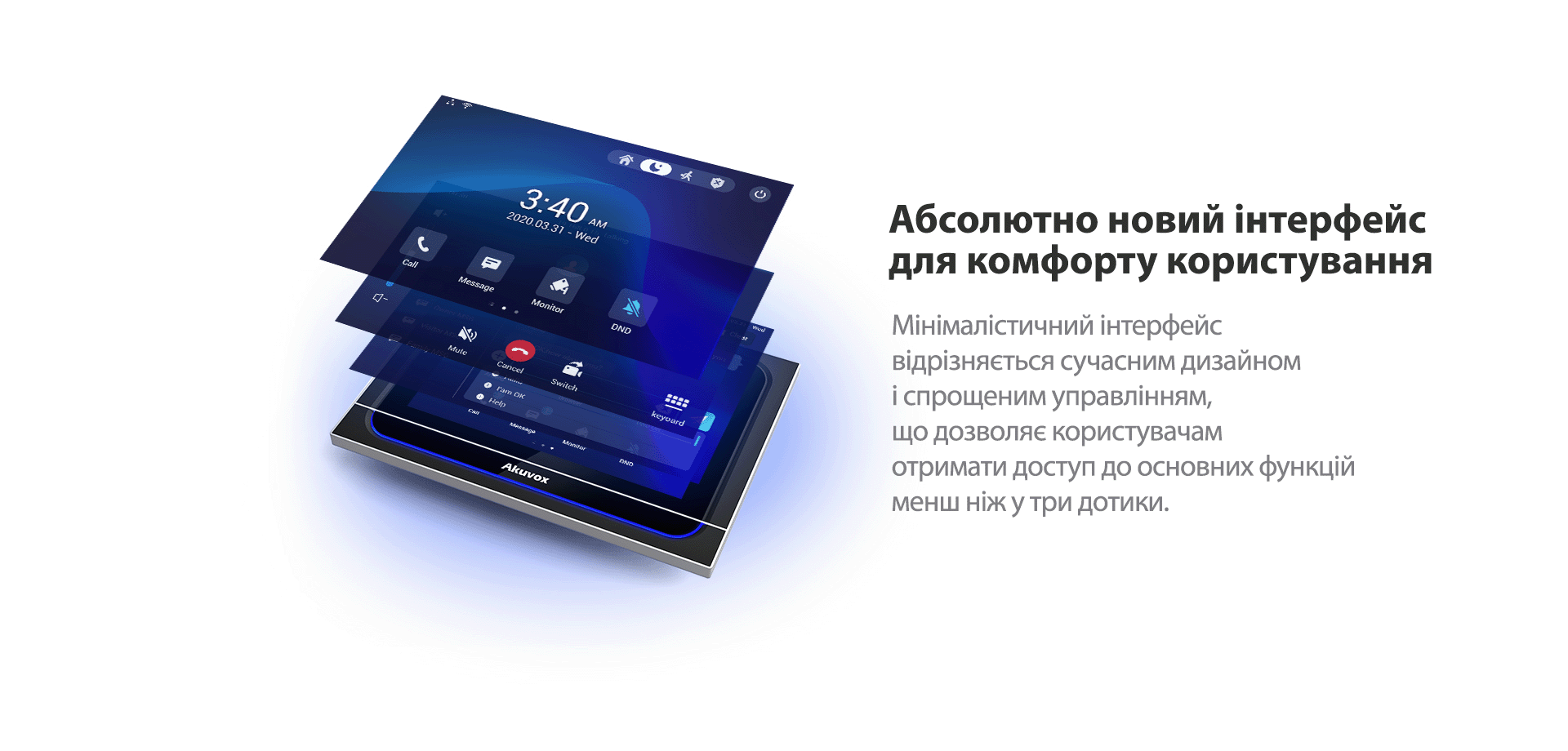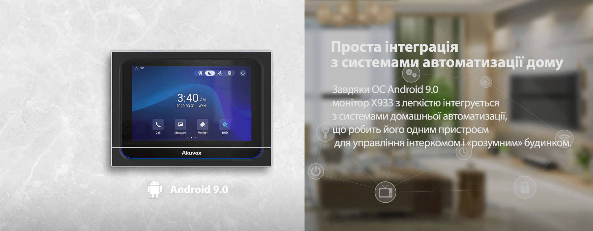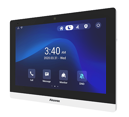 - Багатофункціональний монітор Akuvox X933W з операційною системою Android 9.0 забезпечує ідеальний аудіо- та відеозв’язок з панелями виклику через протокол SIP 2.0.