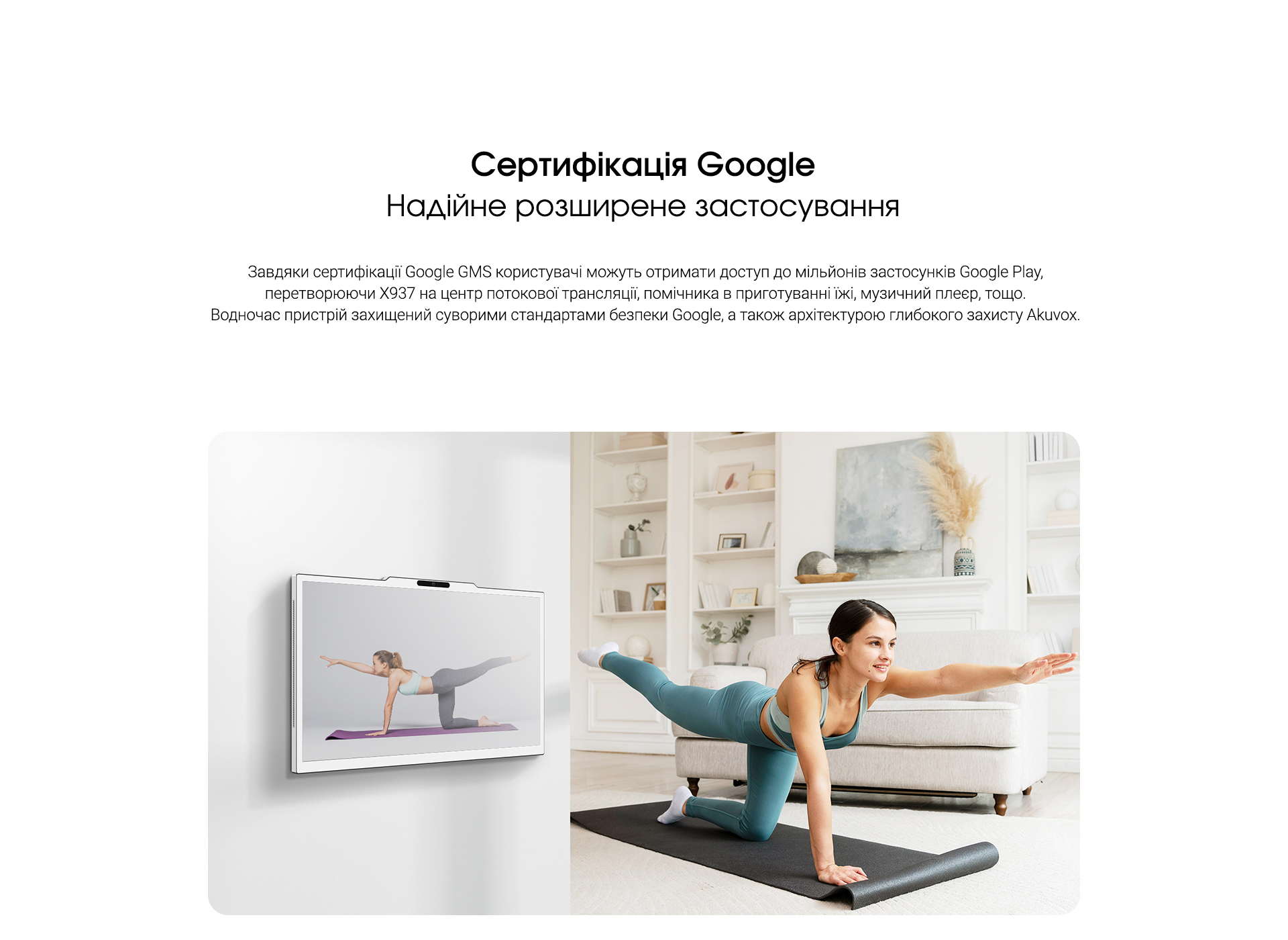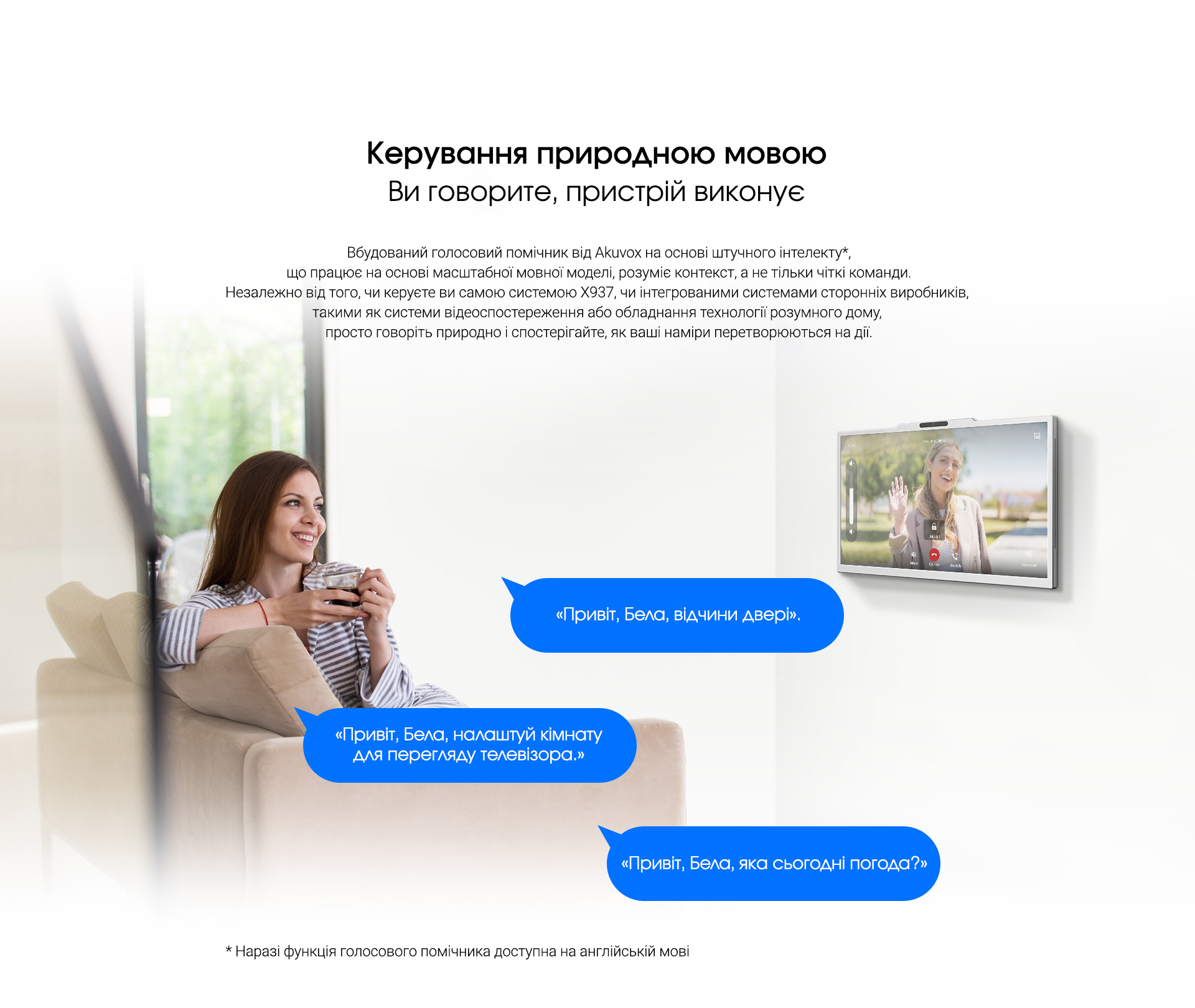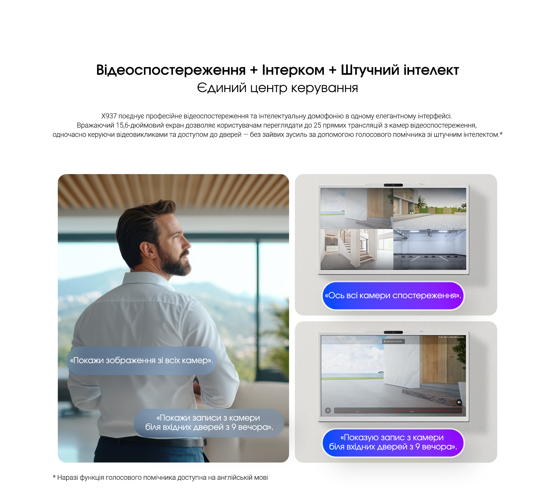 X937 працює під управлінням ОС Android 14. Як перший у своєму роді розумний монітор для приміщень, він об’єднує функції відеоспостереження через підключені по HDMI мережеві відеореєстратори, розумний інтерком і голосовий помічник на базі великої мовної моделі в елегантному, багатофункціональному інтерфейсі.