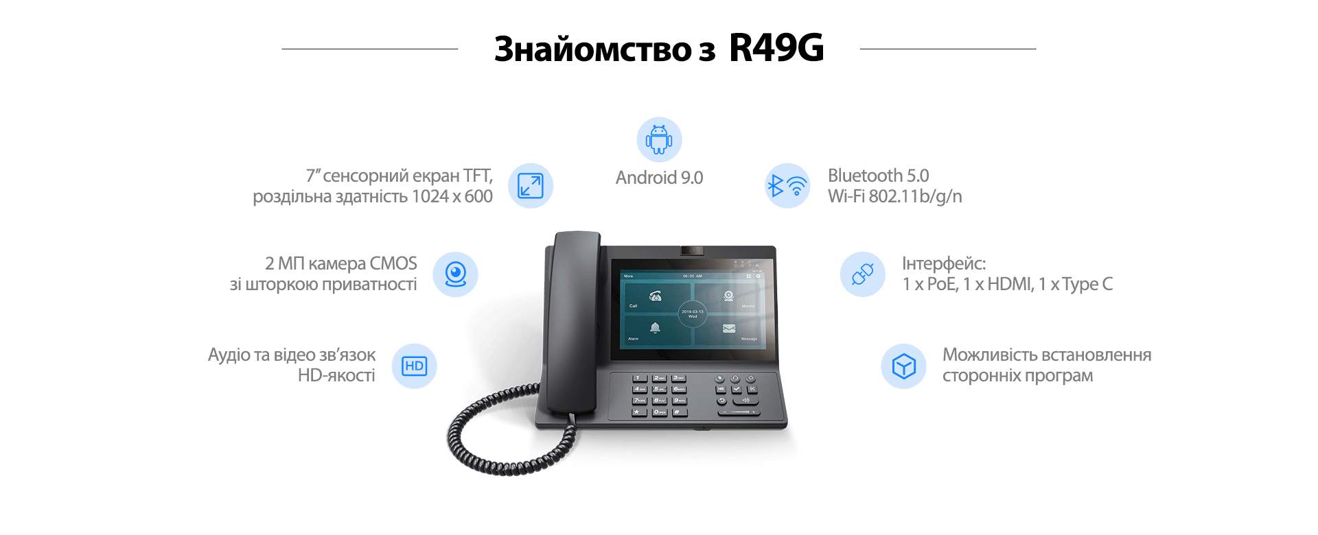 Akuvox R49G – це SIP-відеотелефон на базі ОС Android з 7-дюймовим сенсорним екраном. Завдяки двом наборам інтерфейсу користувача, призначеним для комерційного та житлового використання, він може працювати як бізнес-телефон, що підвищує продуктивність, або як багатофункціональний переговорний пристрій для охорони.
