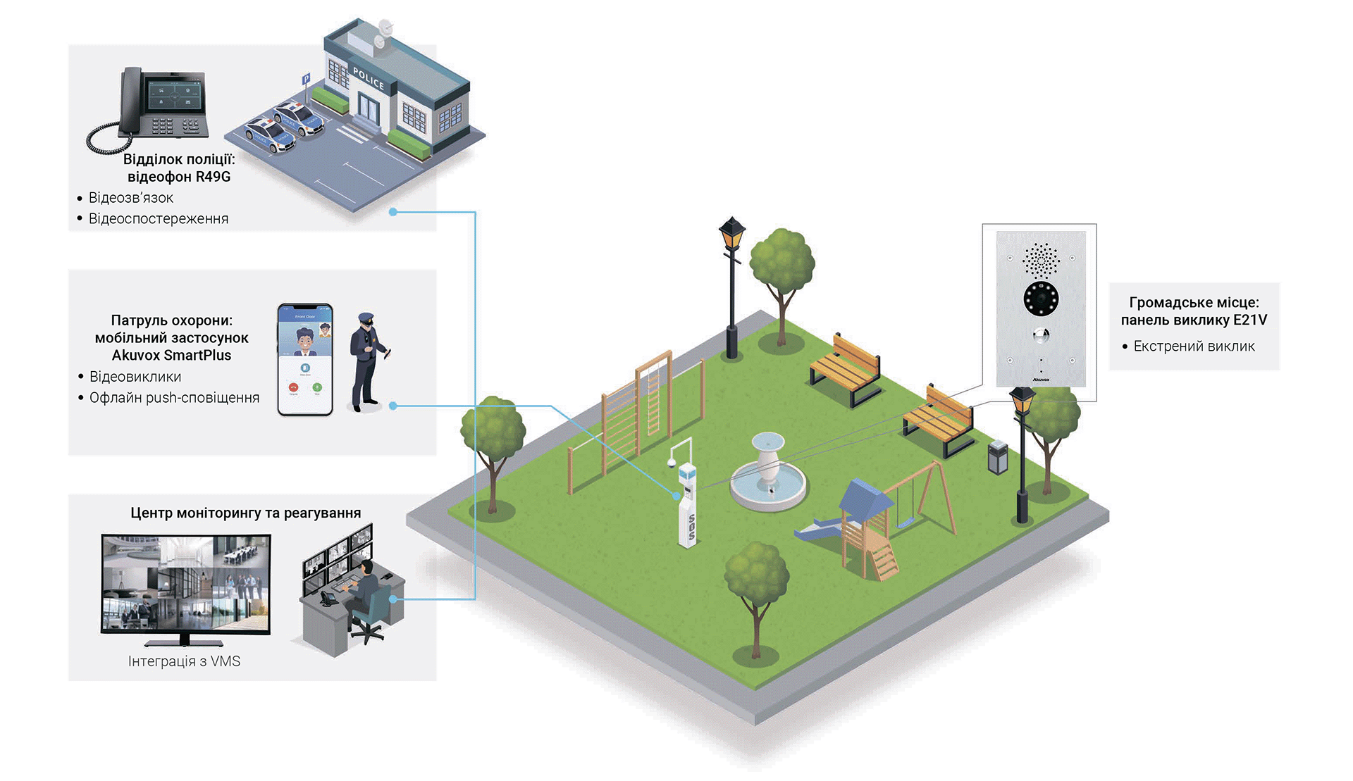 При ініціюванні екстреного виклику на екрані системи відеонагляду з’явиться сповіщення. Крім того, відео з камери домофона може транслюватися на будь-яку систему відеоспостереження з підтримкою ONVIF, щоб вчасно виявити загрозу.