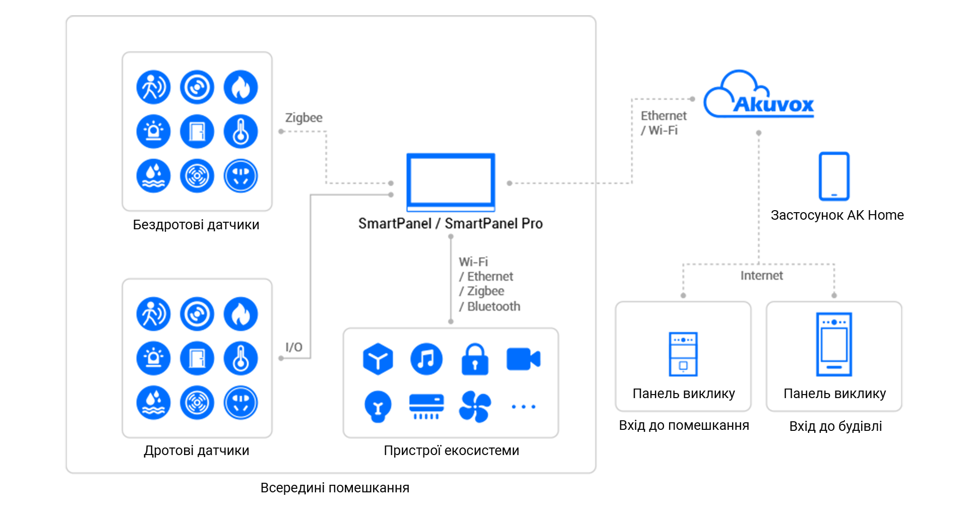 Рішення підтримує бездротове з’єднання, що робить його надзвичайно зручним для інсталятора. SmartPanel підтримує Wi-Fi і Zigbee, а датчики – Zigbee. Це особливо зручно на об’єктах із застарілою проводкою. Крім того, допоміжний інтерфейс полегшує процес встановлення.
